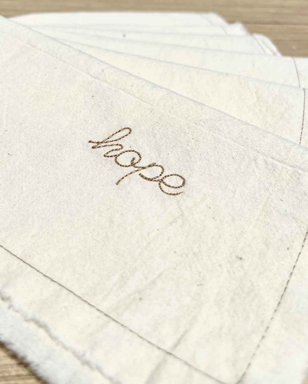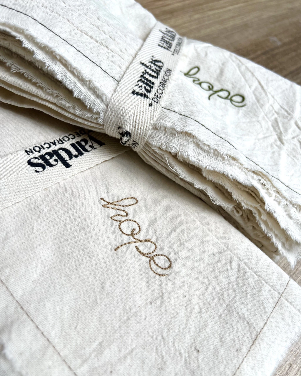Las servilletas están confeccionadas con tela tusor, es un género 100% algodón, viene prelavado por lo que no achica ni destiñe, con un delicado bordado en uno de sus extremos.